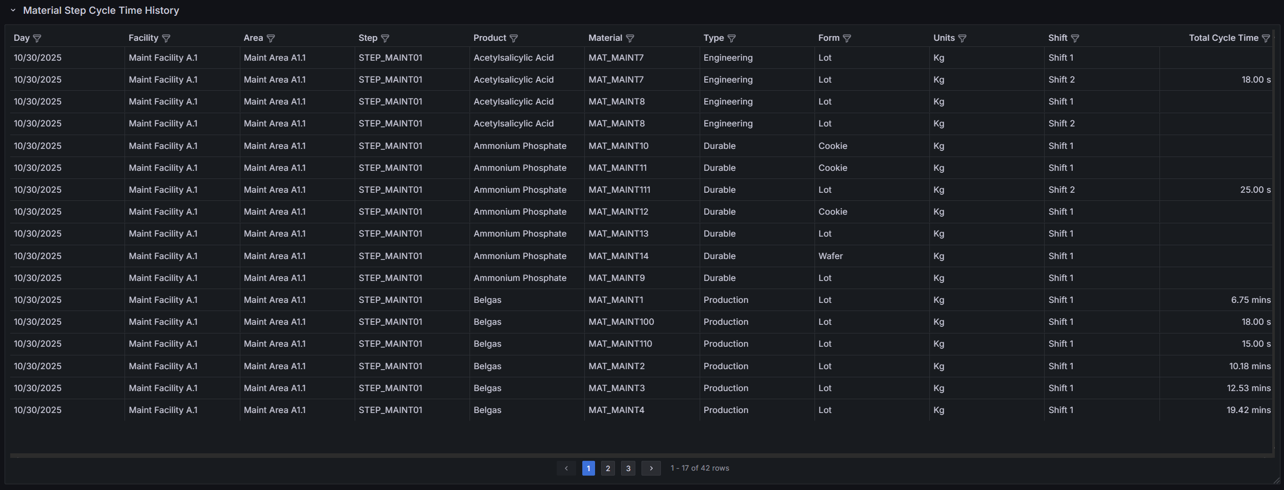 | Material Step Cycle Time History | Detailed table including cycle time history by day, facility, area, step, product, material, form, type, units, and shift. | N/A | material_movement from Material Cube |