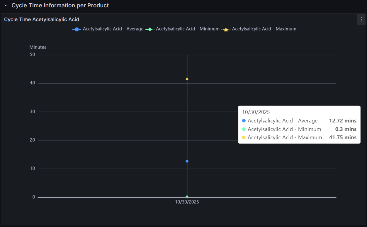 | Cycle Time Trend per Product | Time-series panel for each selected product, showing the evolution of average, minimum, and maximum cycle times per step. | Cycle Times as low as possible. | material_movement from Material Cube |