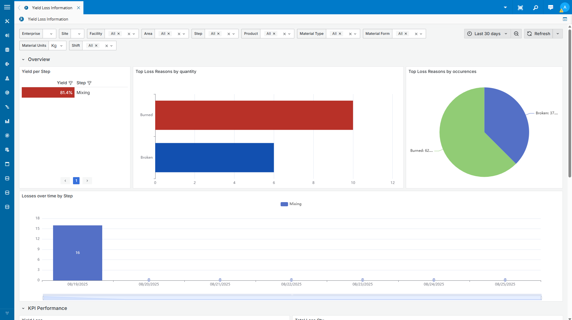 The Yield Loss Information dashboard provides a detailed analysis of Material efficiency by tracking Loss patterns and performance deviations throughout the production process.