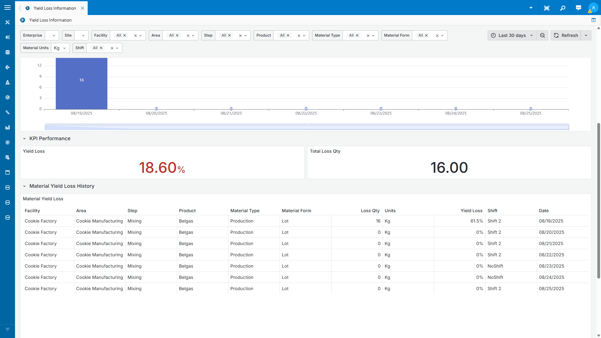 Material Yield Loss History Table presenting the historical record of daily Material Loss transactions. N/A material_movement in Material Cube