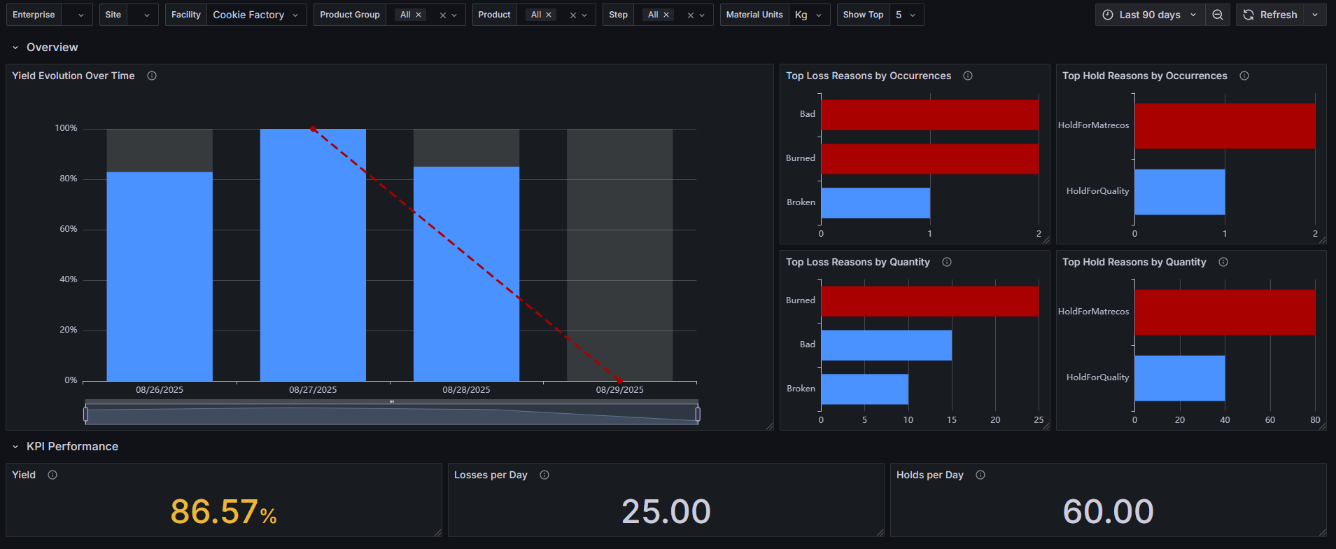 | Yield Evolution Over Time | Bar chart showing daily yield trends within the selected period. | Yield should be as high as possible (green >90%, yellow 80–90%, red <80%). | material_movement cube in Material Cube |