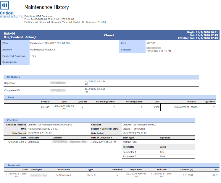 This report provides information about the Maintenance History for one or more Resources.
