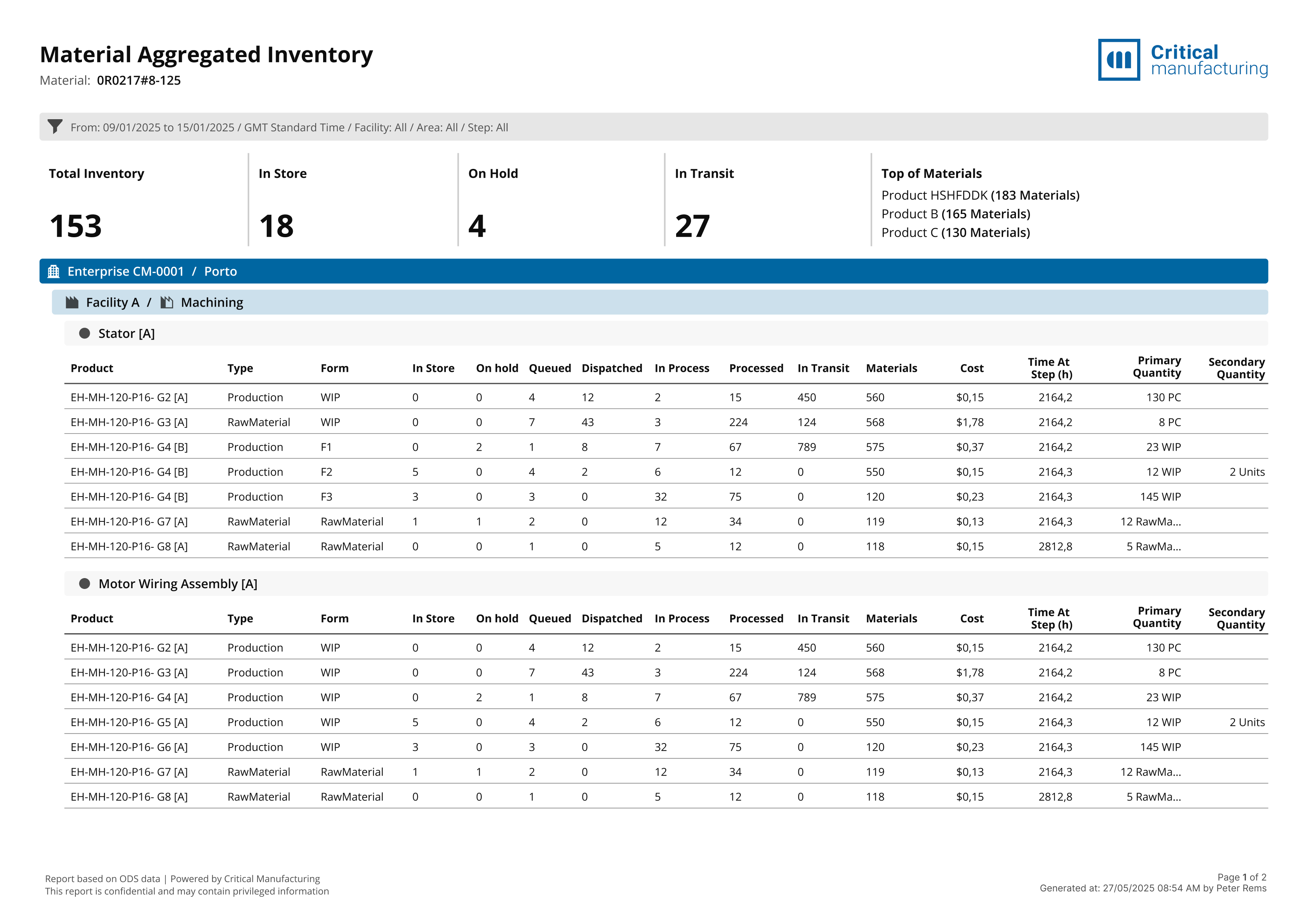 - Third row – Groups all Materials by Step, presenting the aggregated information for each Step.