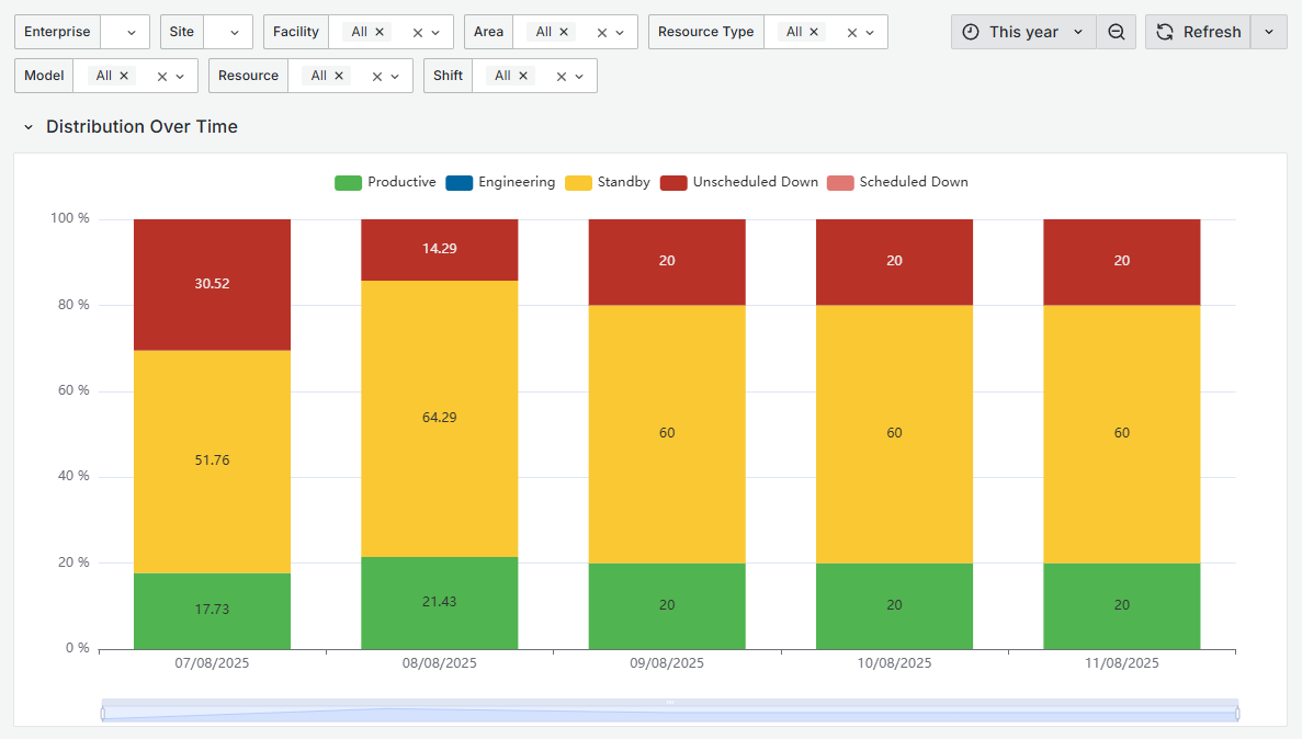 Distribution Over Time Stacked bar chart showing the daily percentage of each state (Productive, Engineering, Standby, Unscheduled Down, Scheduled Down) over the selected time range. Helps identify patterns or anomalies in operational distribution. Productive ≥ 85%, Unscheduled Down ≤ 5% resource_states in Resource Cube