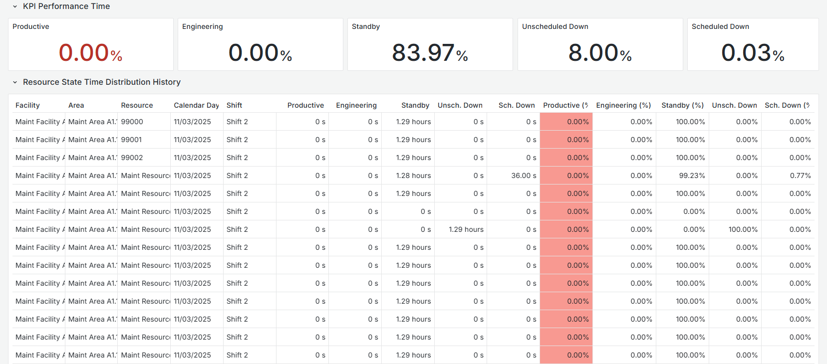 KPI Performance Time Displays the overall percentage of time spent in each state for the selected period. Productive: Green ≥ 90%, Yellow 80–90%, Red < 80% resource_states in Resource Cube