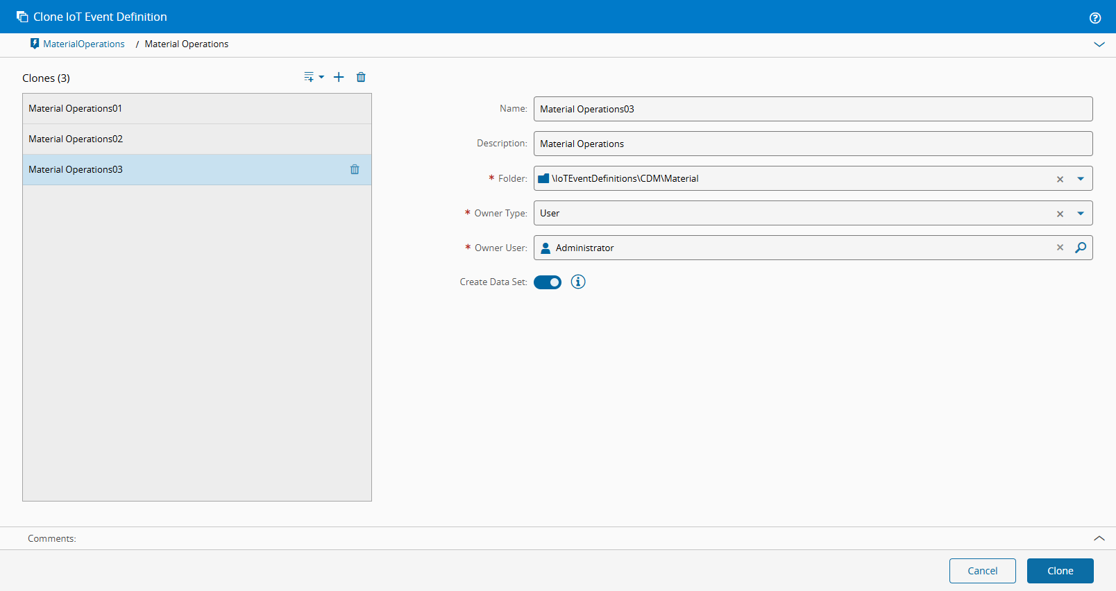 The Clone IoT Event Definition wizard can be called from the IoT Event Definition page within the Business Data Group. The default values will be taken from the current IoT Event Definition to be used as a base for the new object.
