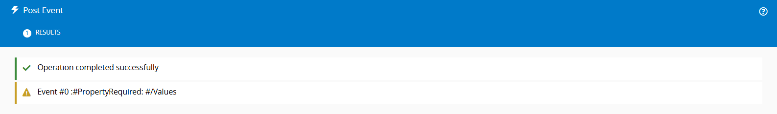 If an event is posted without one or more required properties, the wizard completes successfully but displays a warning. The warning message explicitly identifies the name of the missing required property (for example,