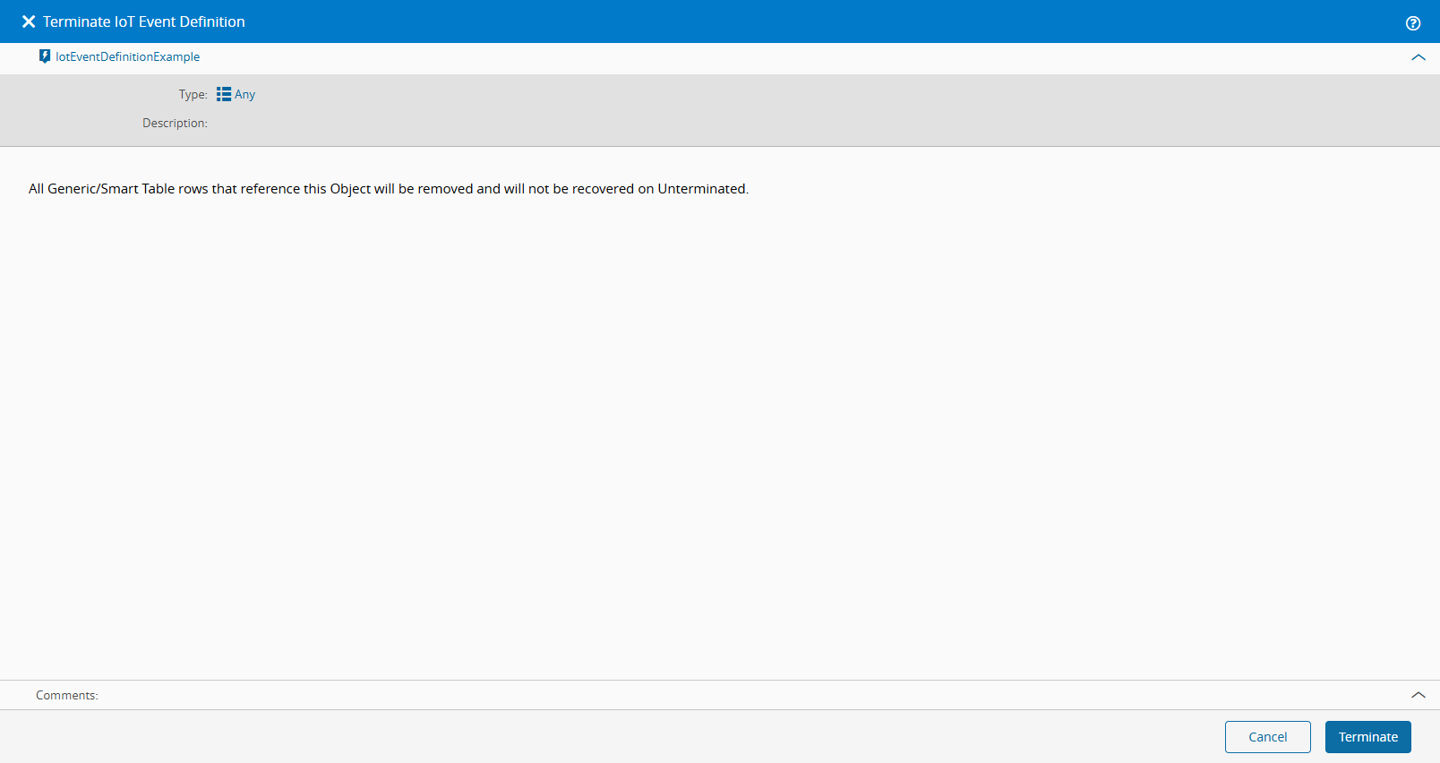 Select Terminate to perform the operation. All generic/smart table rows that reference the current object will be removed and will not be recovered if the object is unterminated at a later point.