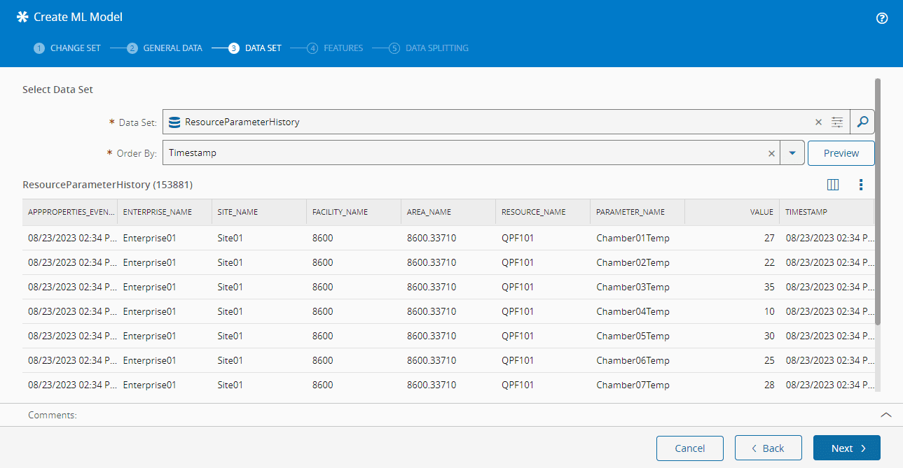 In this tab, you will be able to view a summary of the data as well as edit the properties and transformations applied to the features associated to each of the fields retrieved through the selected Data Set.