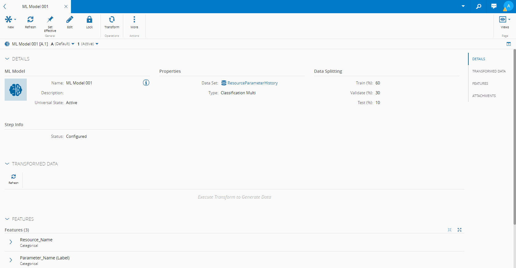 • Transformed Data - displays the transformed data of this ML Model. Needs data generated by a previous transformation.