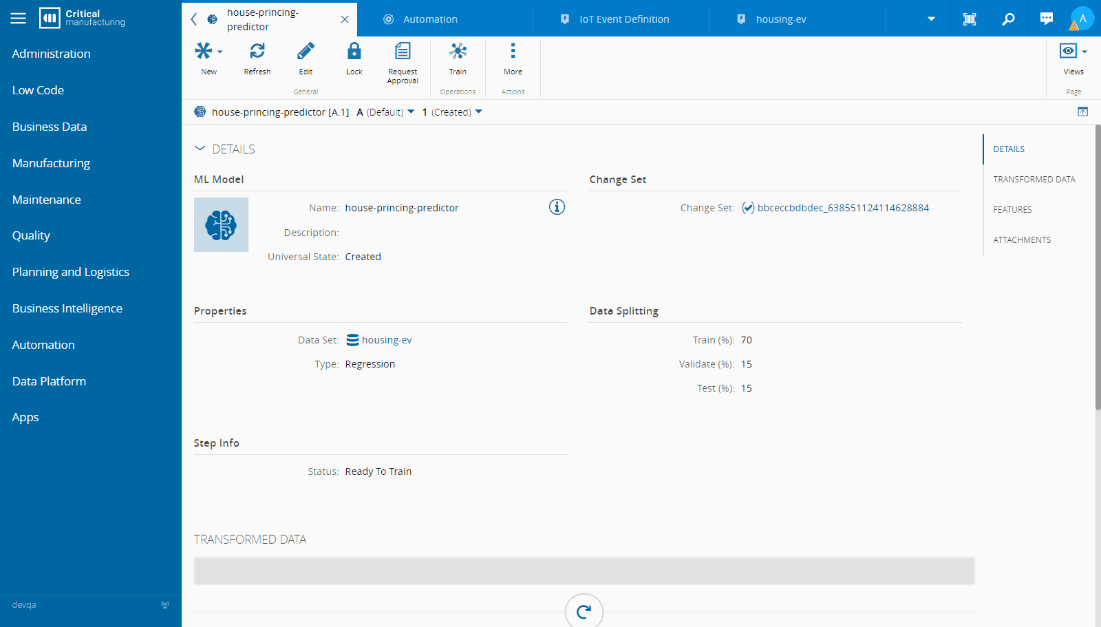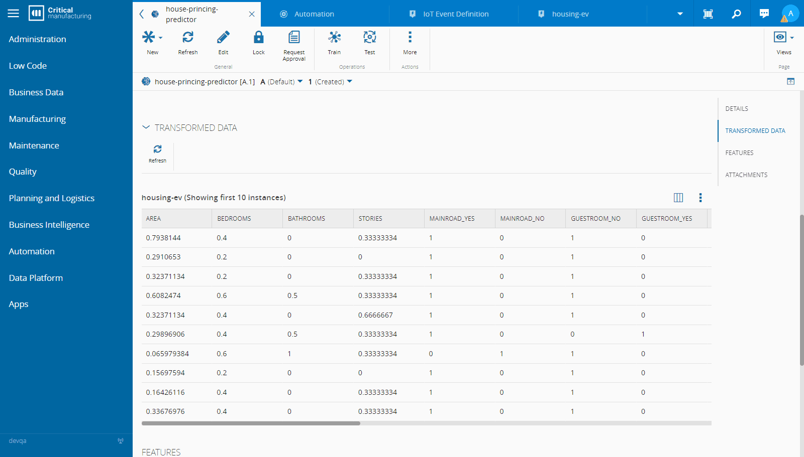 When the transformation is applied, the normalized features can be observed in the Transformed Data section.
