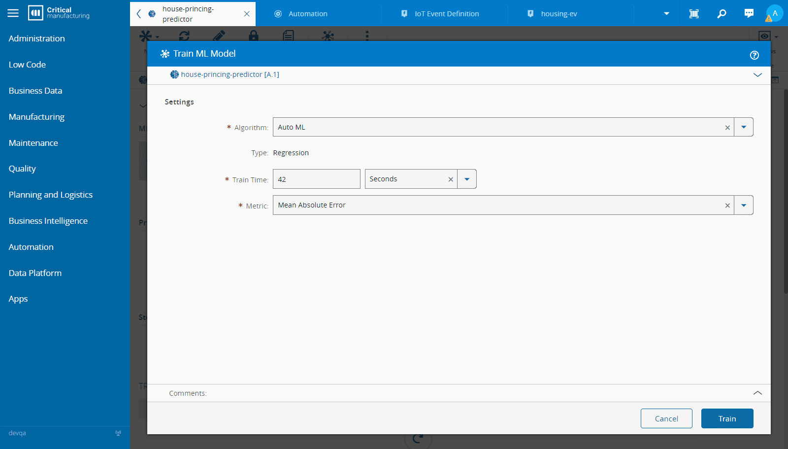 Select Train on the top menu to train the model by choosing how long the AutoML algorithm should run and the metric to optimize.
