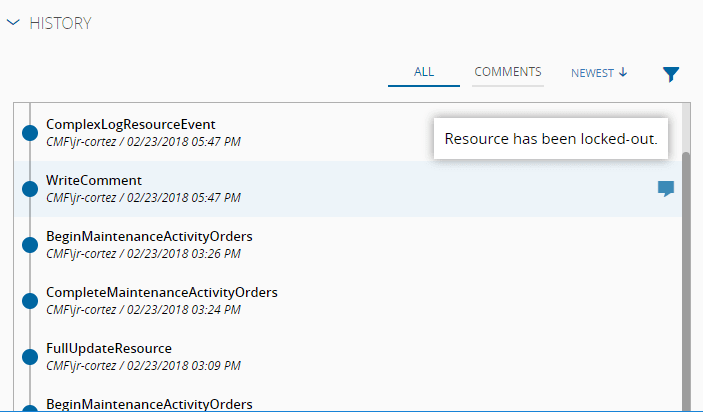 - Hovering over the comment symbol, in the All tab - WriteComment operation.