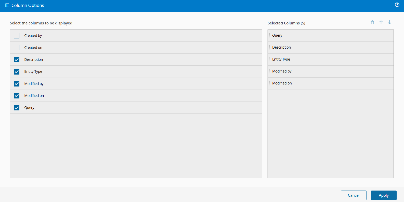 - Change the order of the selected columns by dragging and dropping them or by using the and arrows.