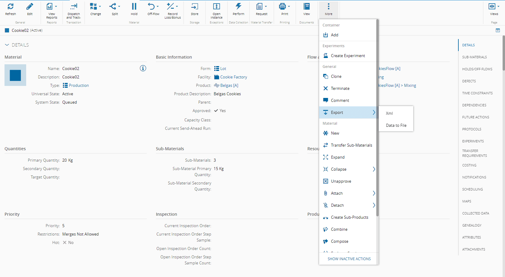 Critical Manufacturing MES offers a feature of mass Master Data Export where you can export data from the entire system for backup or offline analysis or migration. However, you can also export data from individual entities by selecting the Export from the top ribbon of an entity details page.