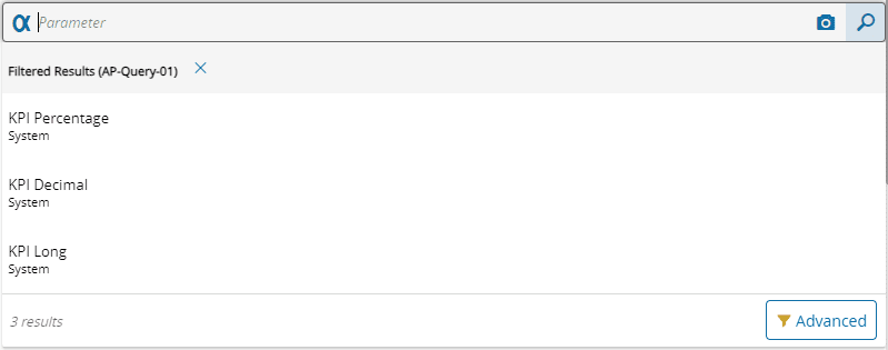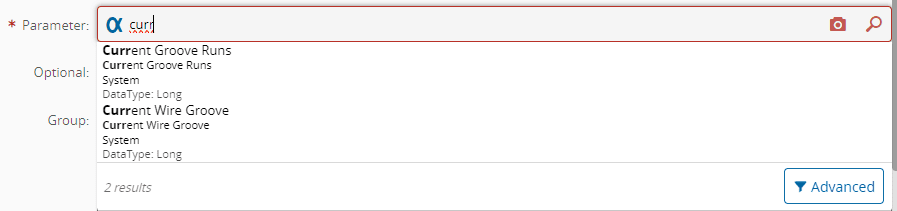 In some situations, additional fields can be displayed along with the searchable properties as a way to provide further detail for a specific operation. An example is below, showing Name, Description and ModifiedBy as searchable properties, with the added property of Scalar Type as a helper for the context for Parameter selection: