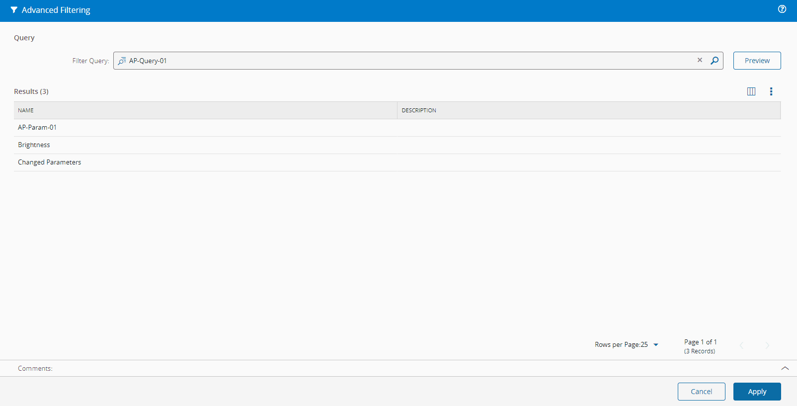 When performing a search for an object, you use a default query that applies specific filters based on the current context for the object and the entity type. Selecting the icon will open the main window of the component and display an Advanced button. Selecting that button will display a new window, which allows you to select a custom query to be used as a filter. It will also allow flexibility to create your own query, preview the results and use the new query in this situation: