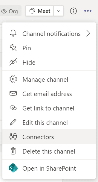 - Open Microsoft Teams and navigate to the team window where you wish to send the Notification. On the top right hand corner of the team window (or on the right hand side of the team name in the left sidebar), press the three dots and from the context menu choose Connectors.