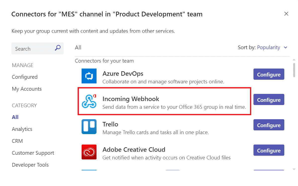 - Select Incoming Webhook and press Configure.