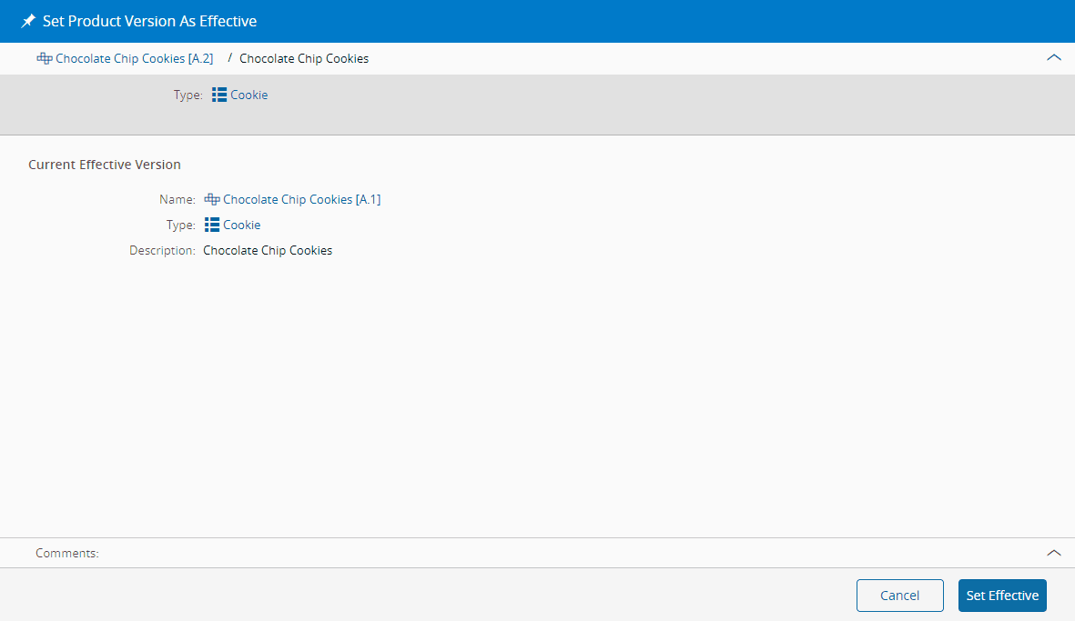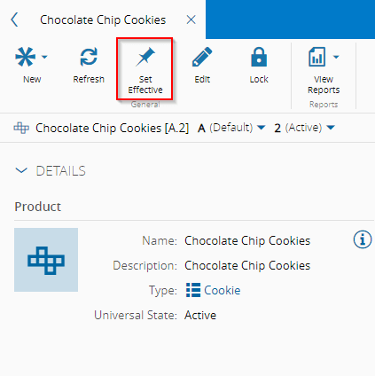 To set a version as Effective, it is necessary to select the desired version and then press the Set Effective button (middle button in the versioning chunk). Note that only active versions can be set effective.