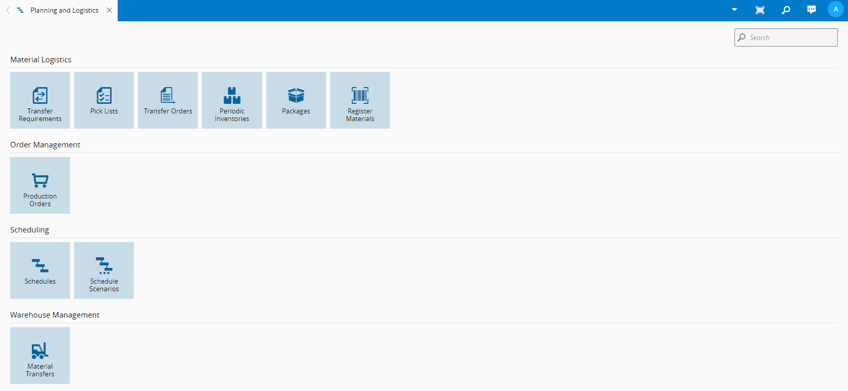 The Planning and Logistics page group provides access to the entities required for Material Logistics, Order Management, Scheduling, and Warehouse Management.