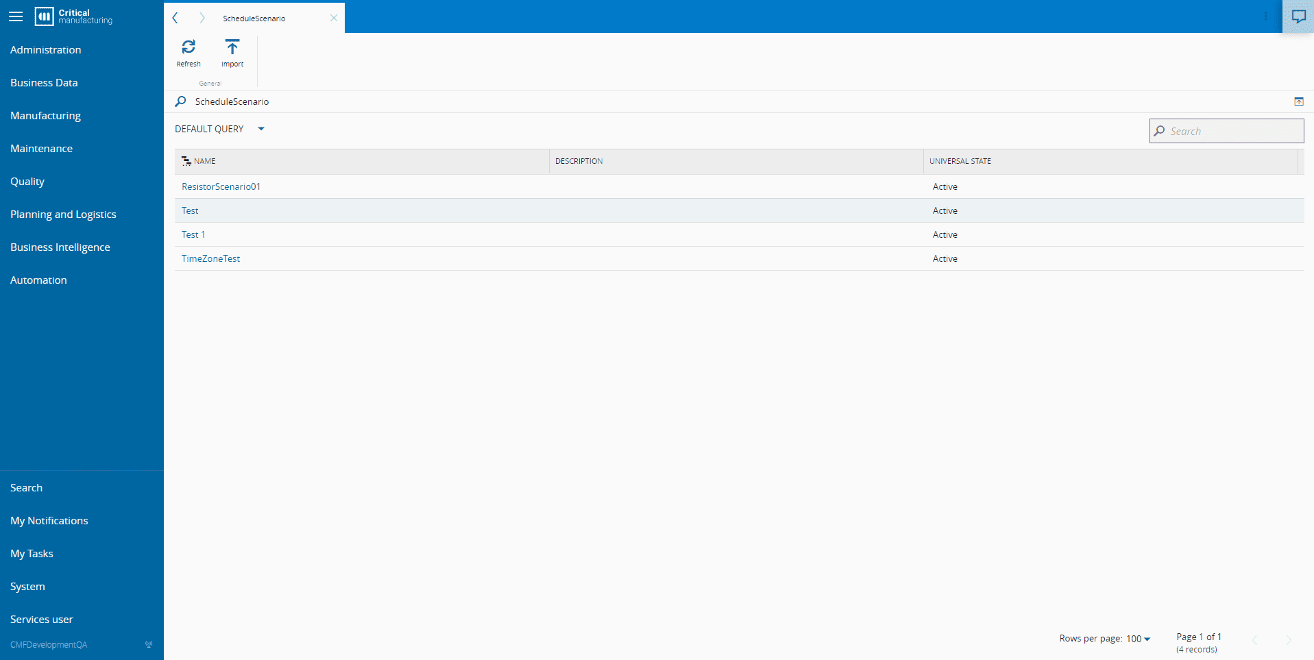 The Schedule Scenario page lists all the active Schedule Scenarios in the system.