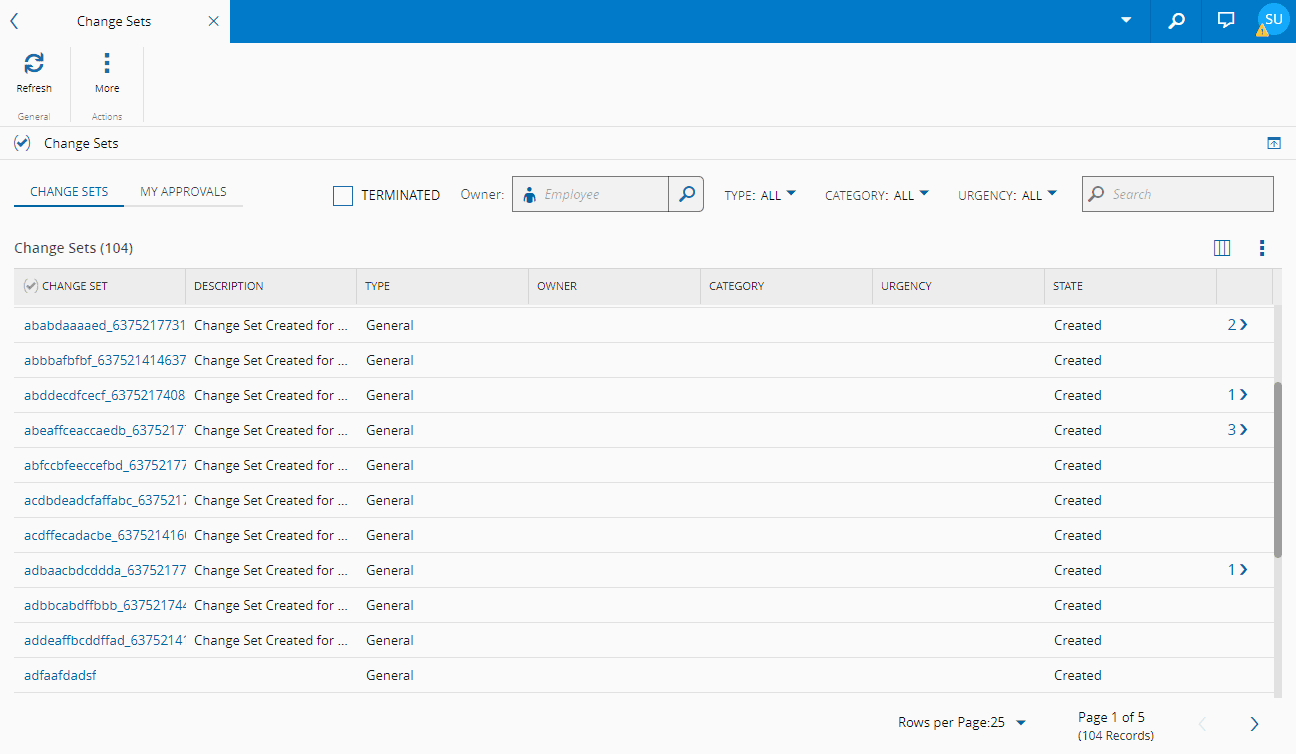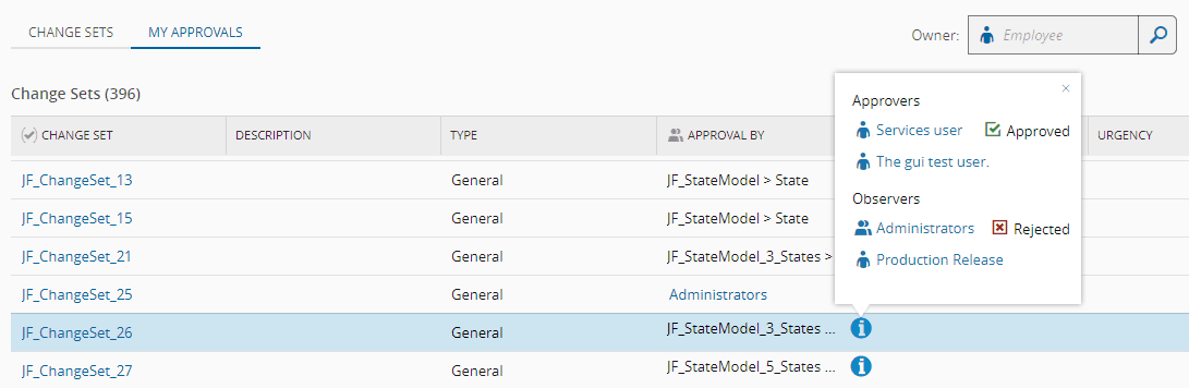 If the My Approvals tab is selected, the system displays a similar view, showing all Change Sets where you can act as approver.