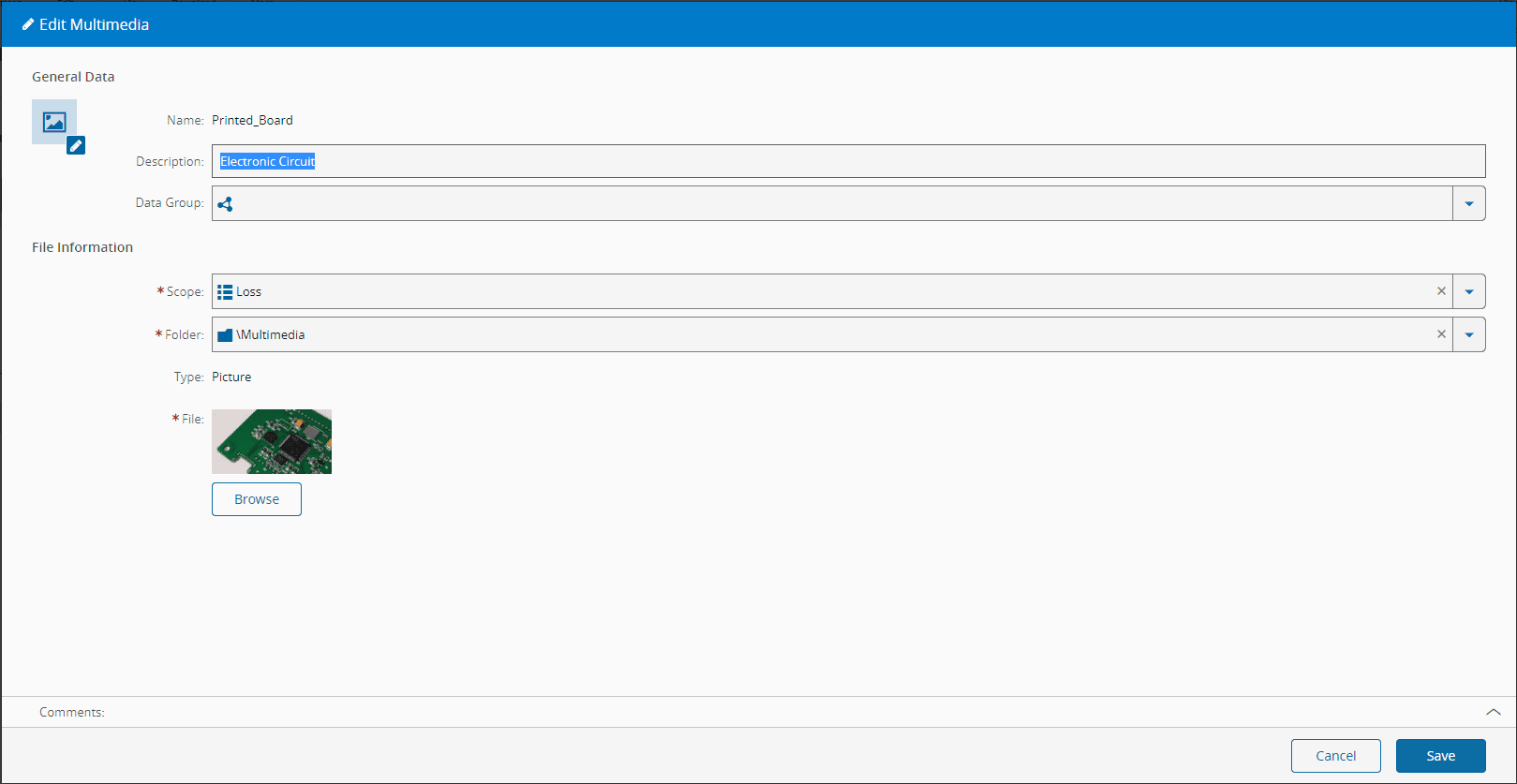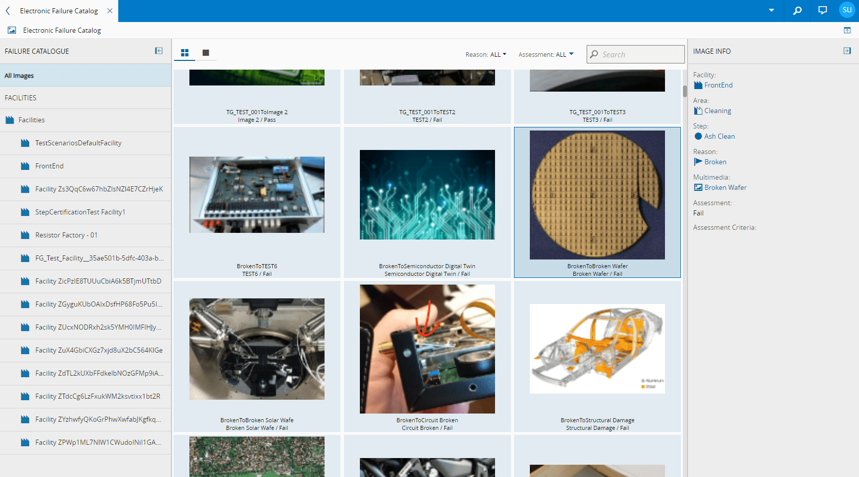 The Electronic Failure Catalogue page provides access to a collection of visual images generated automatically in the system based on information from Multimedia objects of scope Loss and the associations between Multimedia objects and Loss Reasons. This information is used to create a visual structured catalogue, which is also used when recording Material losses.