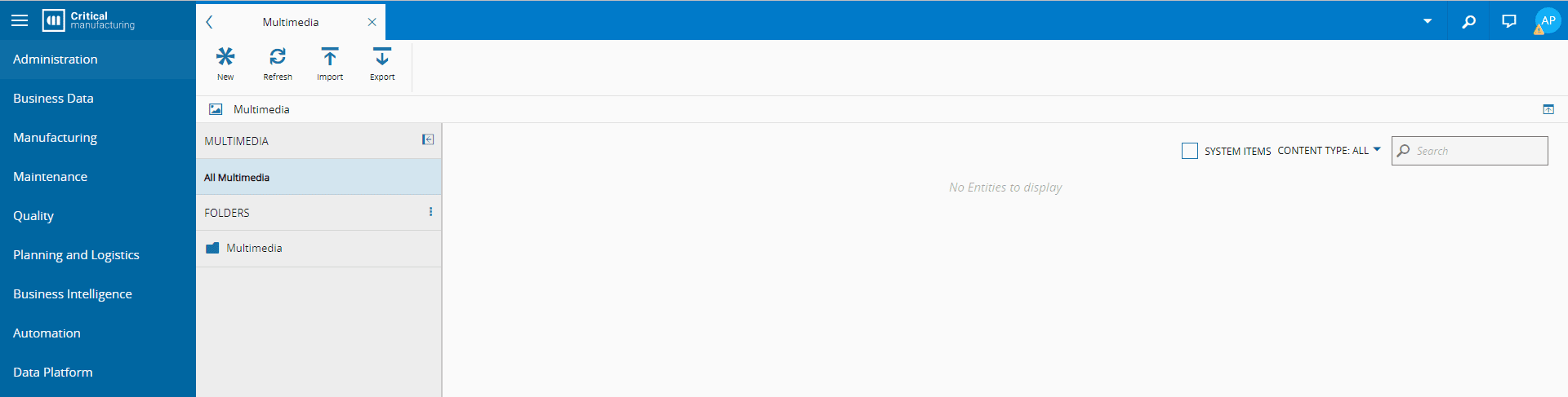 1. In the Administration menu, Create Multimedia by selecting New on the top ribbon: