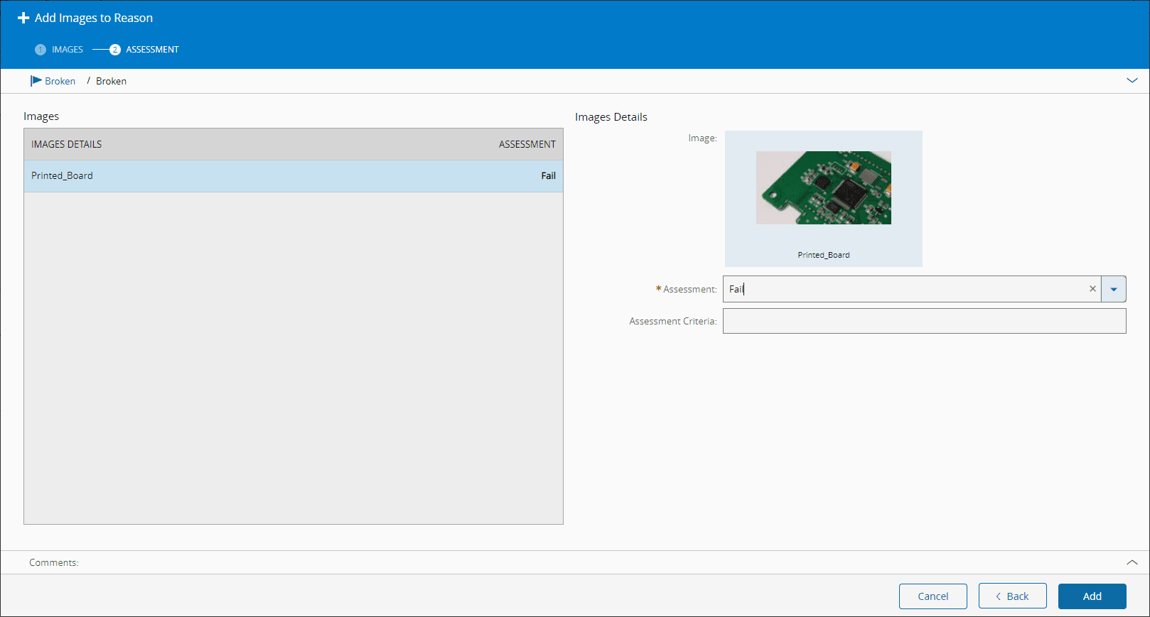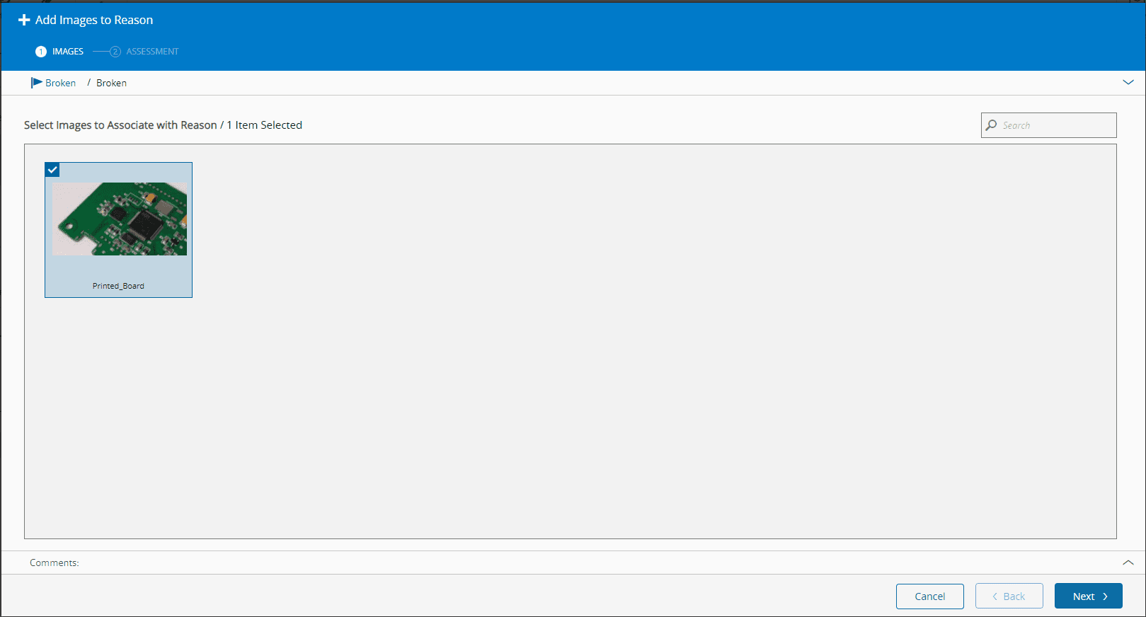 You can interact with the viewer panel by selecting the desired category on the left-hand panel and drill down through the Facility, Area, Step and Reason tree. From there, each sub-category will have a subset of associated images that can be seen in the center panel, and information will be displayed on the right-hand panel. The default view is a thumbnail view but you can view a single image on-screen by switching the view type on the top-left corner of the central panel. From here, you can: