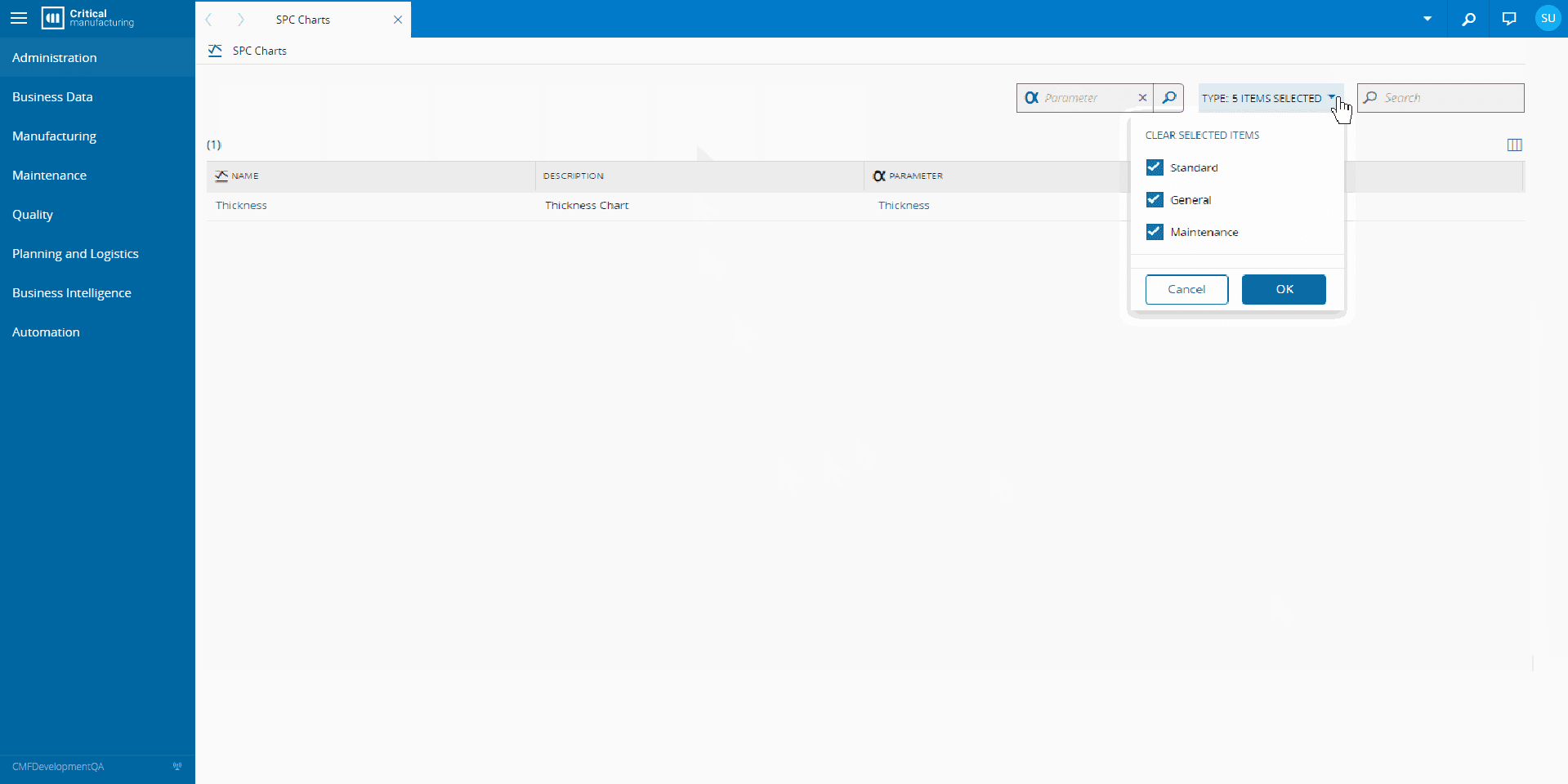 It is possible to search for specific SPC Charts depending on their Parameter, as well as to filter them by Type or to search for a specific Chart by using the search box.