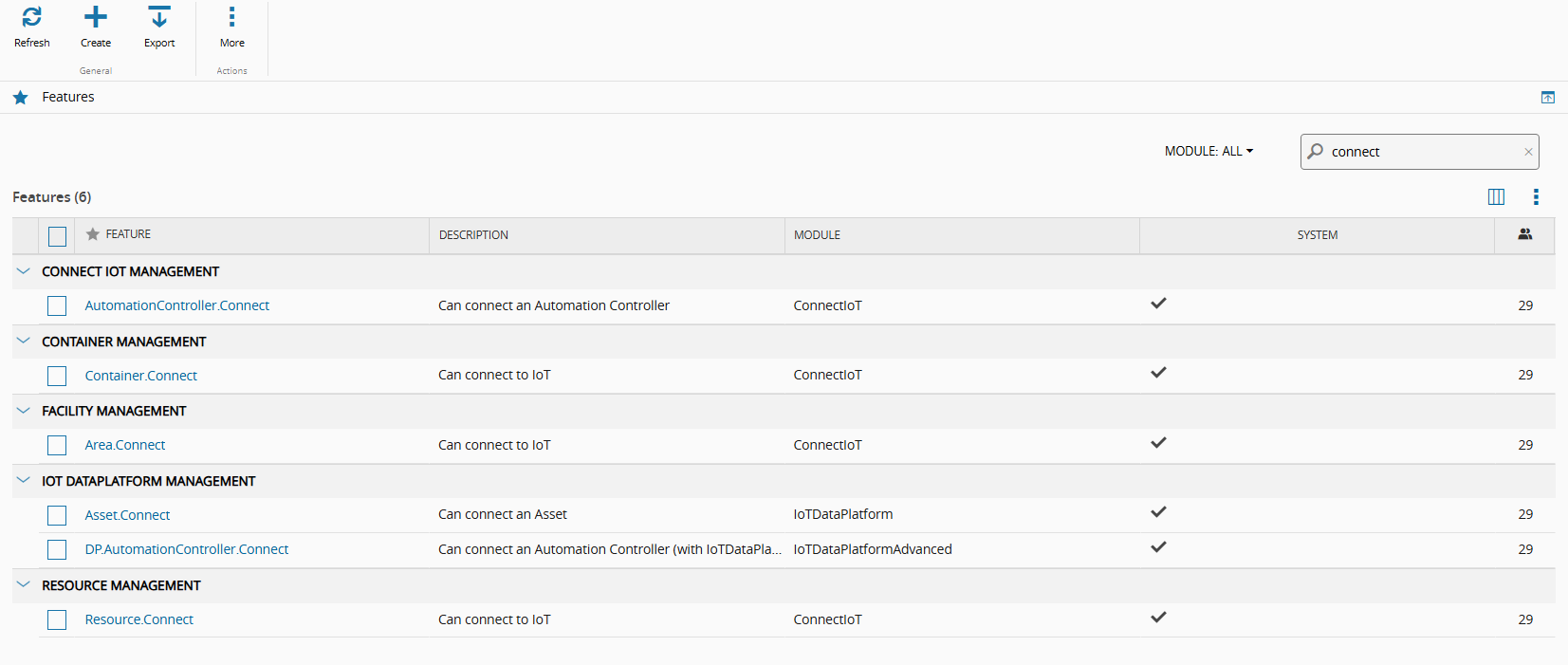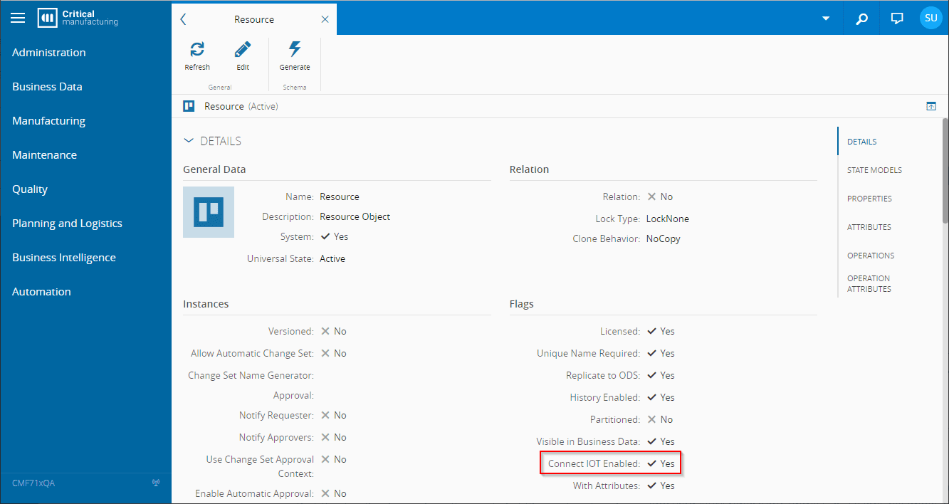 To use the Connect IoT module in the MES system, you must have an approved license. If all entities shown in the image below are available, your Connect IoT license is active and fully functional.
