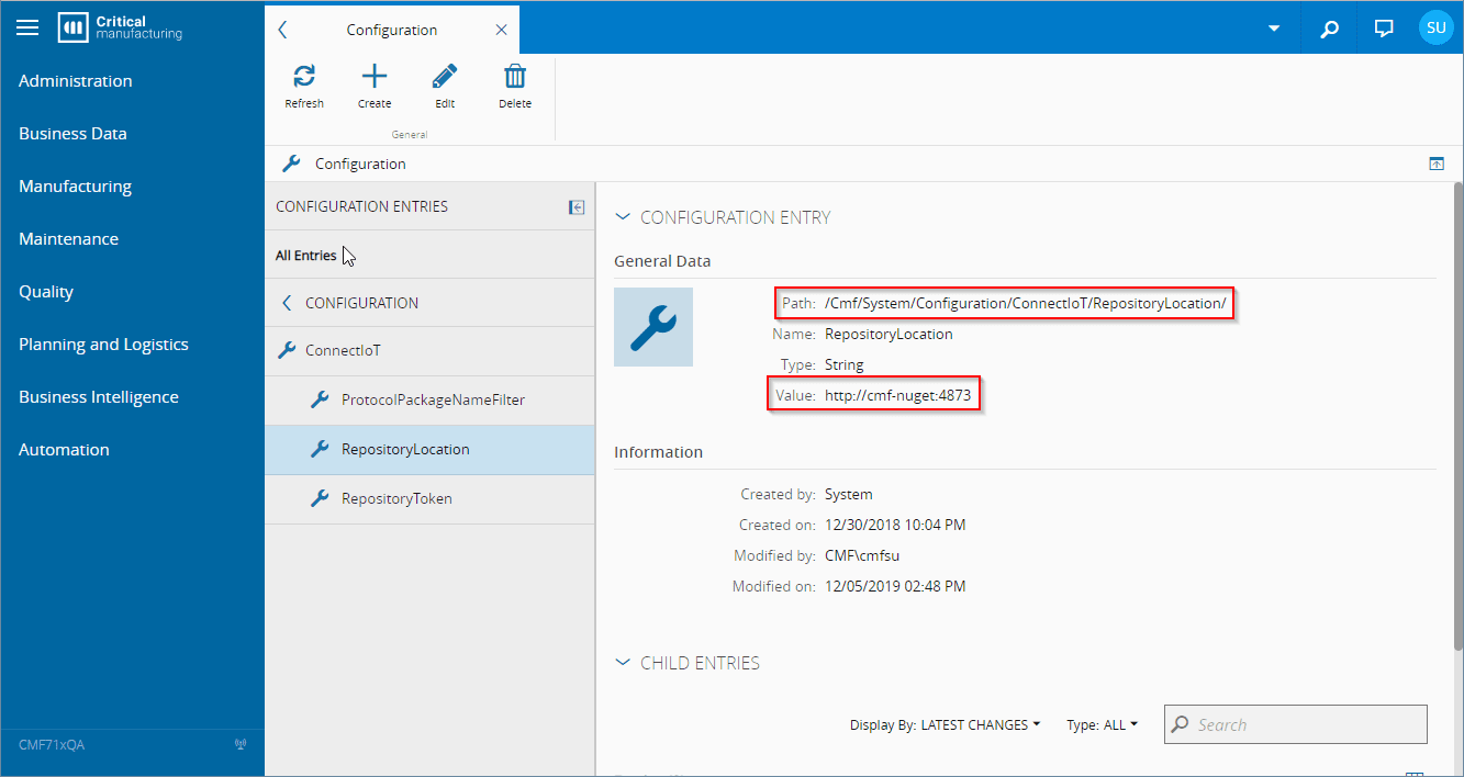 By default, only the automation business scenarios supplied by Critical Manufacturing are visible when using the AutomationBusinessScenario entity. To allow custom/additional business scenarios packages to be used, use the Configuration page located in Administration > Configuration, search for "IoT" and fill out the values for path /Cmf/System/Configuration/ConnectIoT according to the following table: