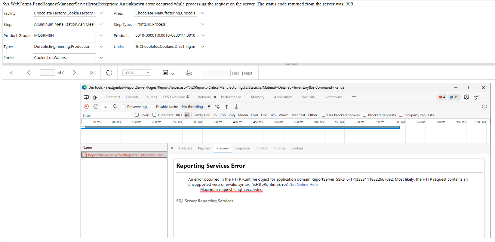 When attempting to use a report while supplying a very large parameter (with 39k Products in this example), the following error might be occur: