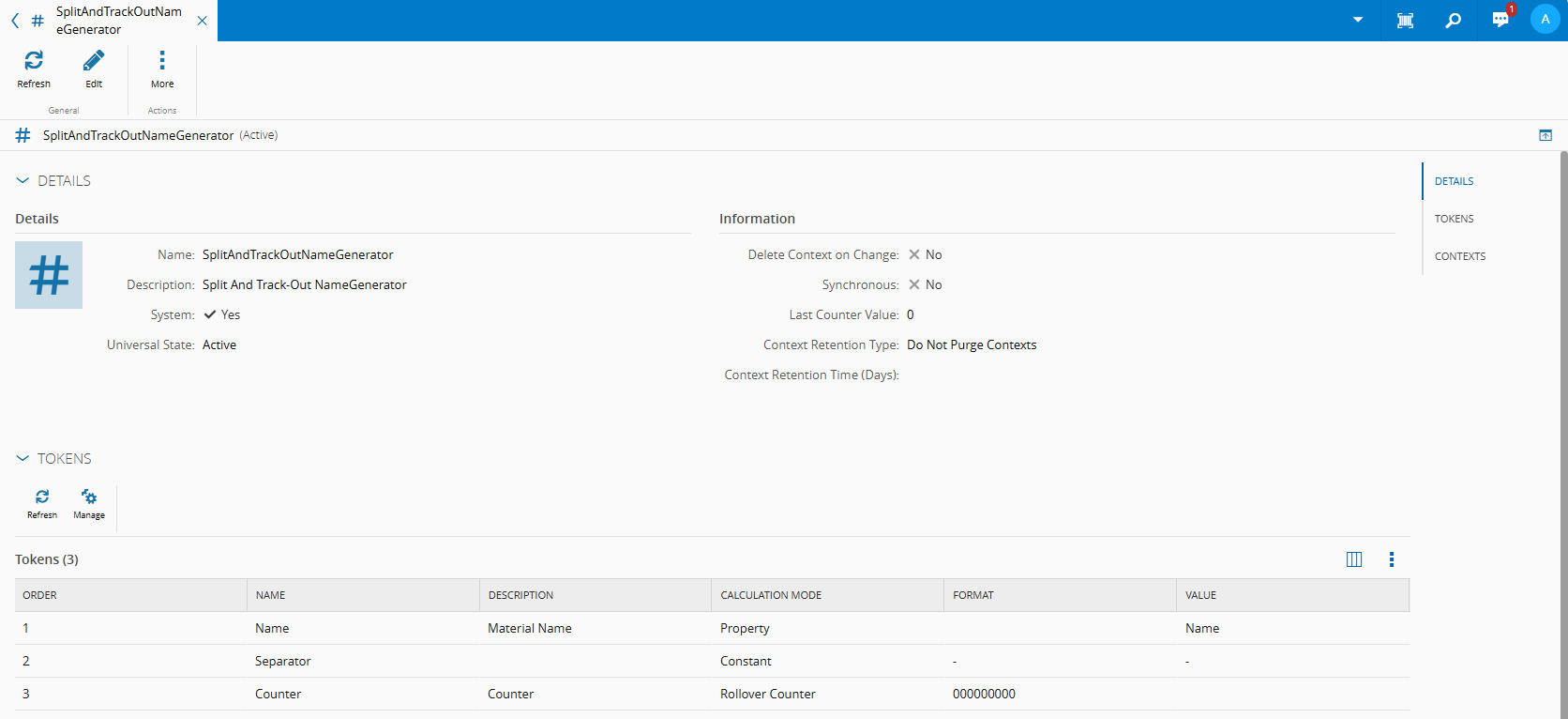 Looking at the Name Generator in question, in the Tokens section, it is possible to see the structure that the new Partial Track-Out Material will have: