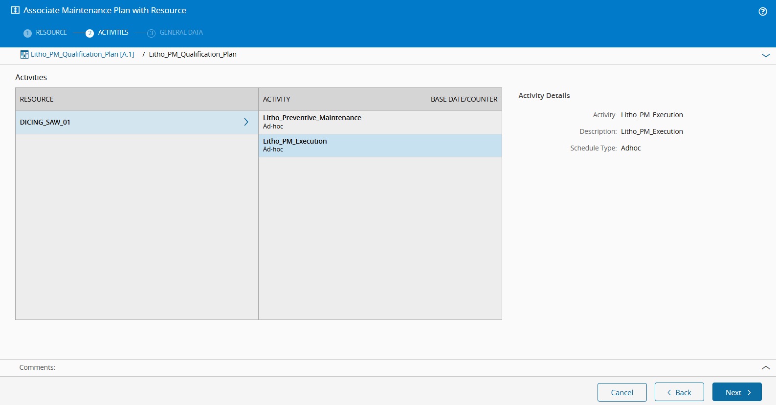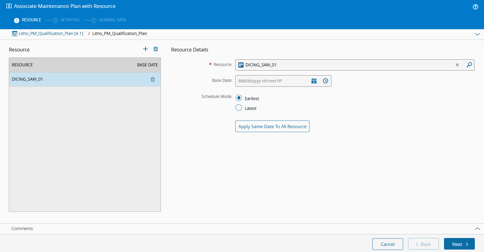 In this tutorial, we will associate the Maintenance Plan with the DICING_SAW_01 Resource. To do this: