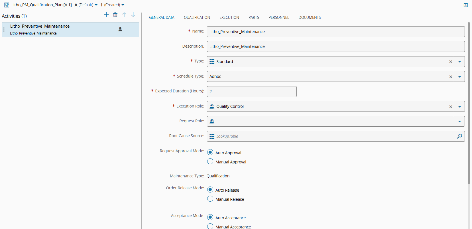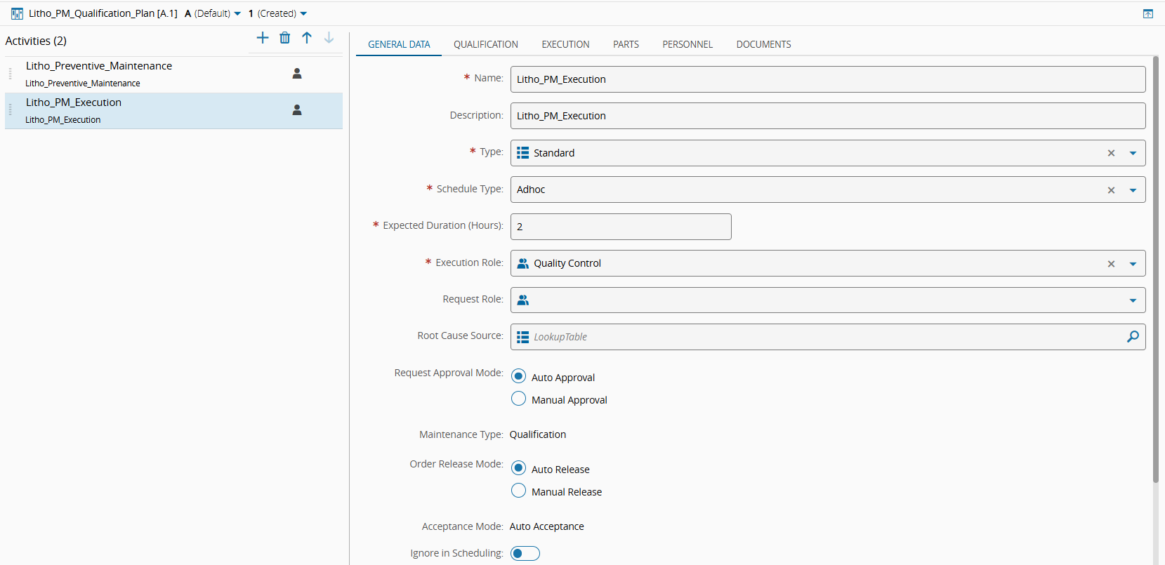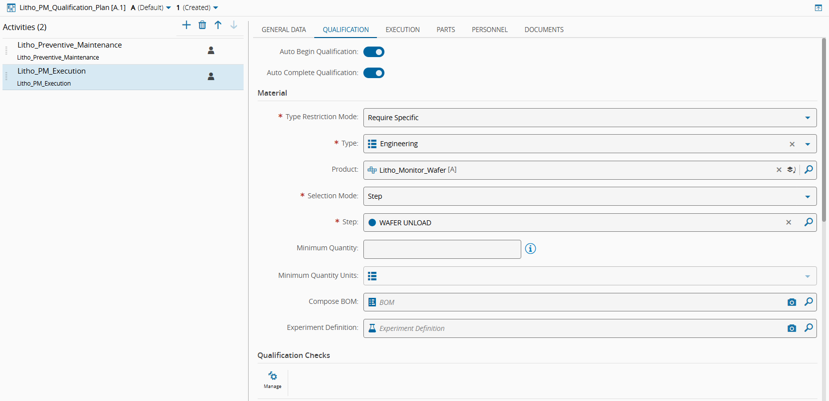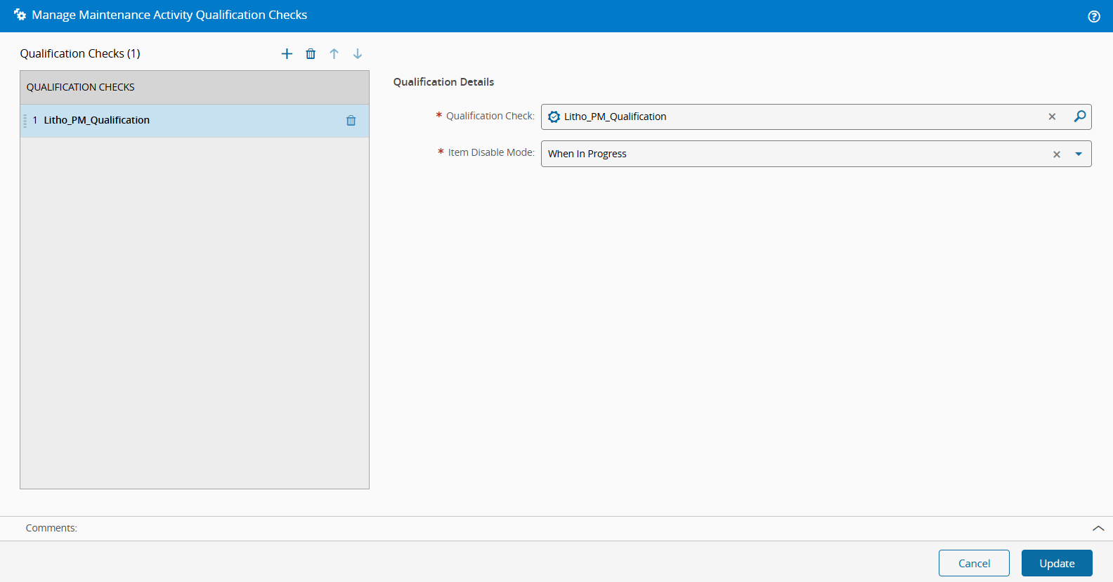 Finally, associate the Qualification Check with the Maintenance Activity. To do so, select the Manage button, add the Litho_PM_Qualification Qualification Check, and set the Item Disable Mode to When in Progress. This means that the Qualification Item will be disabled once the Maintenance Activity is In Progress.