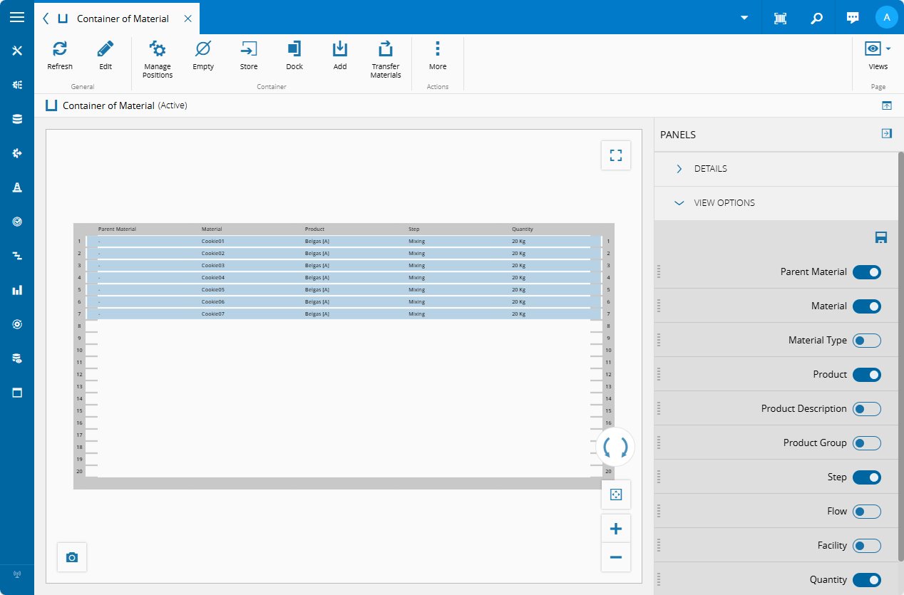 A Material Container has a capacity defined by positions available for a given Material unit. A Container can hold multiple Materials, but each position can contain only one Material.
