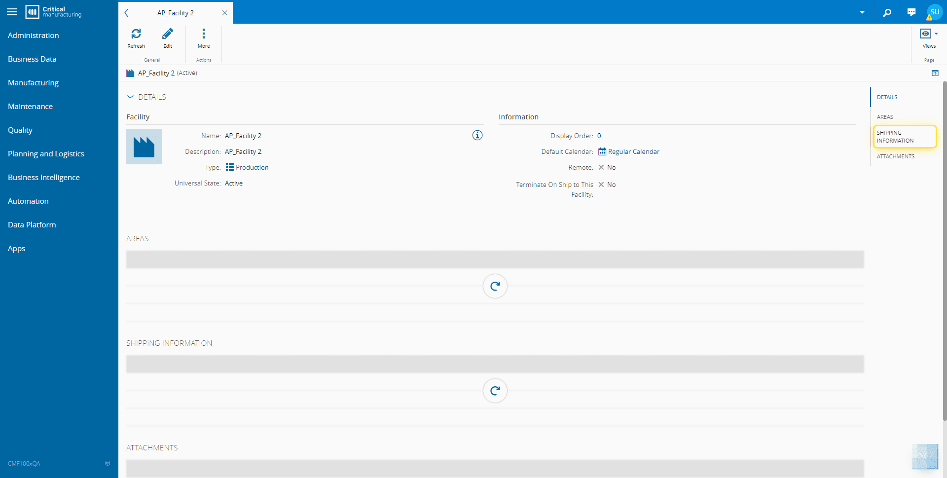 For more information, see Manage Shipping Facilities - Critical Manufacturing Documentation Portal ⧉