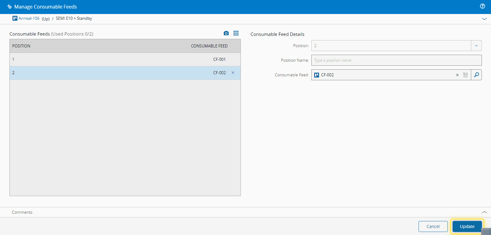 For more information, see Manage Consumable Feeds - Critical Manufacturing Documentation Portal ⧉