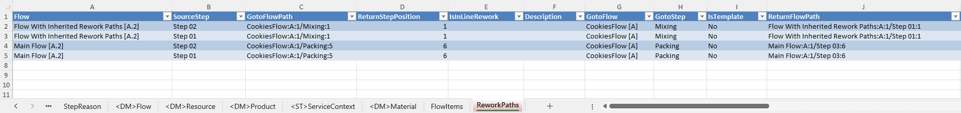 The Rework Paths sheet is where you define the reworking process. Fill in the Source Step, Go to Flow Path, Go to Flow, and Return Flow Path, as shown in the image below.