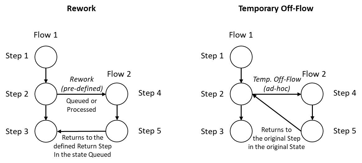 In a Flow composed of Steps, it’s possible to define one or more Rework Paths at each Step. A Rework Path can be associated with an Off-Flow Reason linked to the Step, indicating its relevance for Rework, and it establishes both the Go To Flow Path and the Return point within the Flow.
