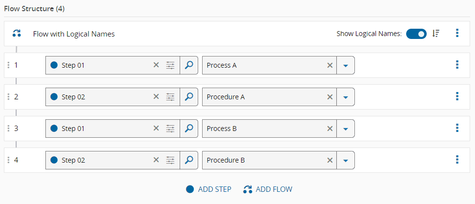 The Logical Name feature provides the flexibility to specify the usage, purpose, or intent of a Step when creating the Flow. You can use the same Flow Items with different Logical Names across various Flows, except for Alternate Flows, Non-Sequential Blocks, or Line Flows.