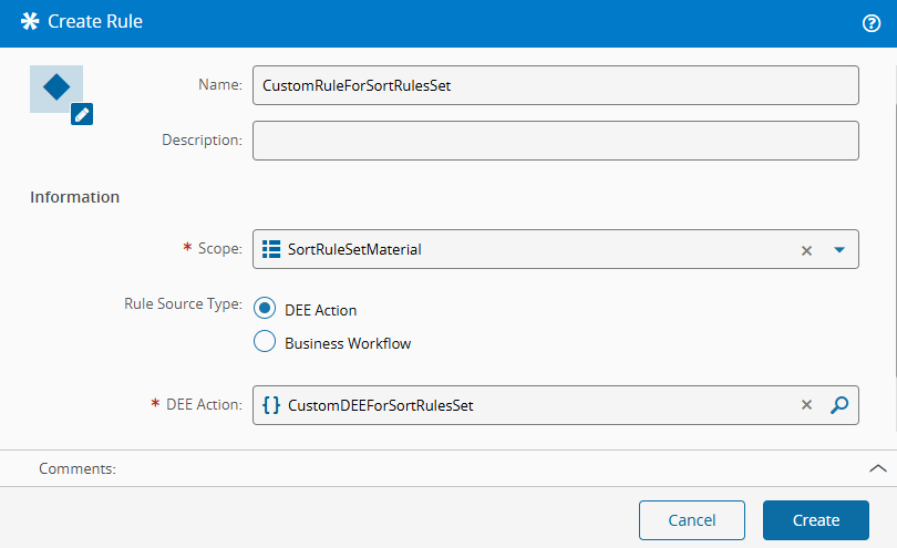 Screenshot showing a DEE action used to implement custom sort rule logic.