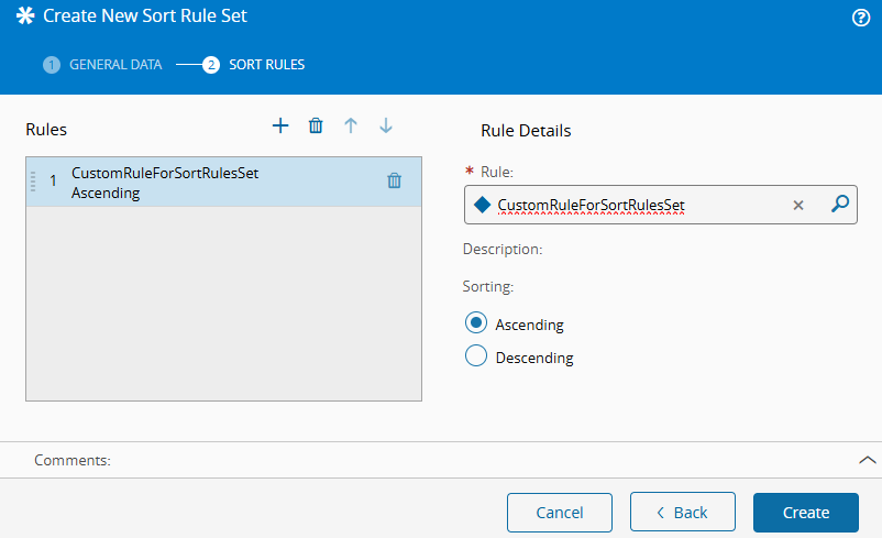 Create the Sort Rule entity that references the rule created in the previous step, and then add that Sort Rule to the target Sort Rule Set through Manage Rules.