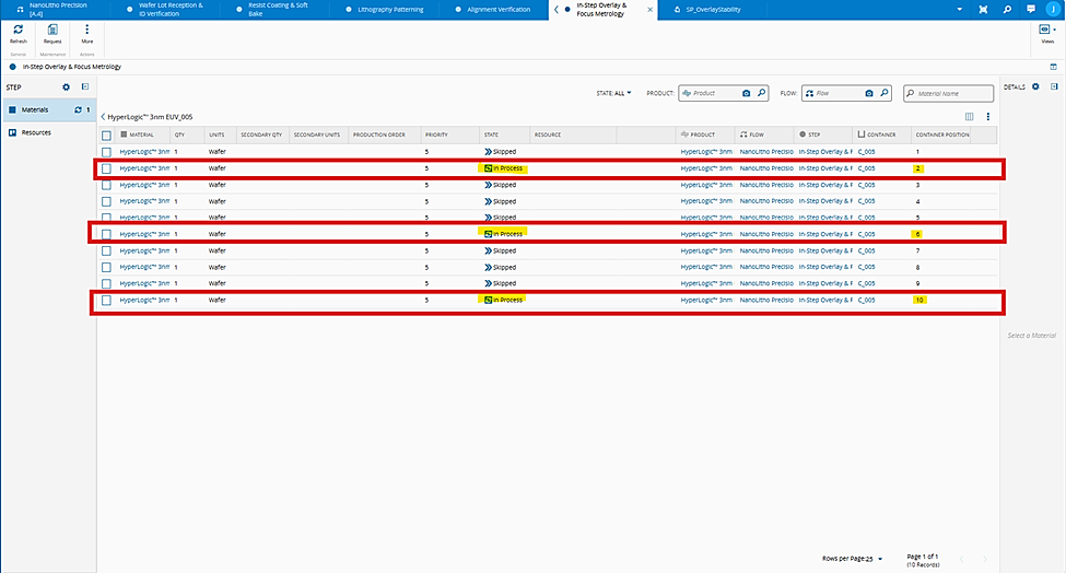 At the In-Step Overlay & Focus Metrology step, perform Dispatch & Track-In on a Material lot with a Container containing the identified positions for its Sub-Materials. For details on the transaction itself, see Track-In Material.