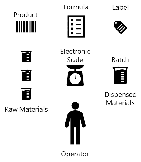 As shown in the figure below, there is a formula that defines the composition of raw materials that are required in certain quantities or proportions to manufacture a certain product. To carry out the Weigh and Dispense process, the operator, following the instructions as provided by the application, picking raw materials of the specified products and then weighing their quantities using an electronic scale until the dispensed quantity falls within the tolerances defined in the formula. Each raw material can be dispensed into the same or different containers and multiple materials of the same product can be used for particular ingredient. After each dispense (partial or complete) the system can print a label that the operator can stick into the dispensed container.