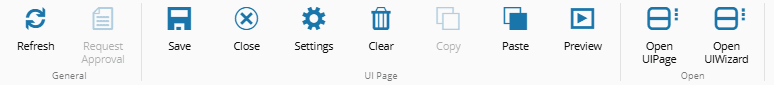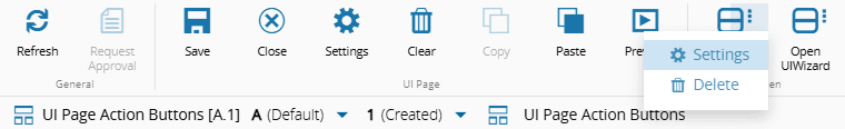 1. In the UI Page Settings wizard, navigate to the Action Buttons tab, and add two Action Buttons: Open UIPage and Open UIWizard. Optionally, group the Action Buttons by defining an Action Group name (for example, Open).