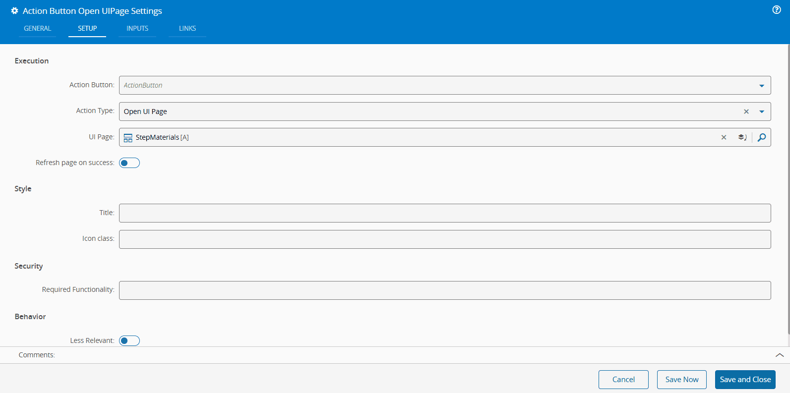 4. In the Action Buttons Settings for the Open UIPage button, navigate to the Setup tab, and choose the Open UI Page Action Type. Additionally, specify the target UI Page (for example, the StepMaterials system UI Page).
