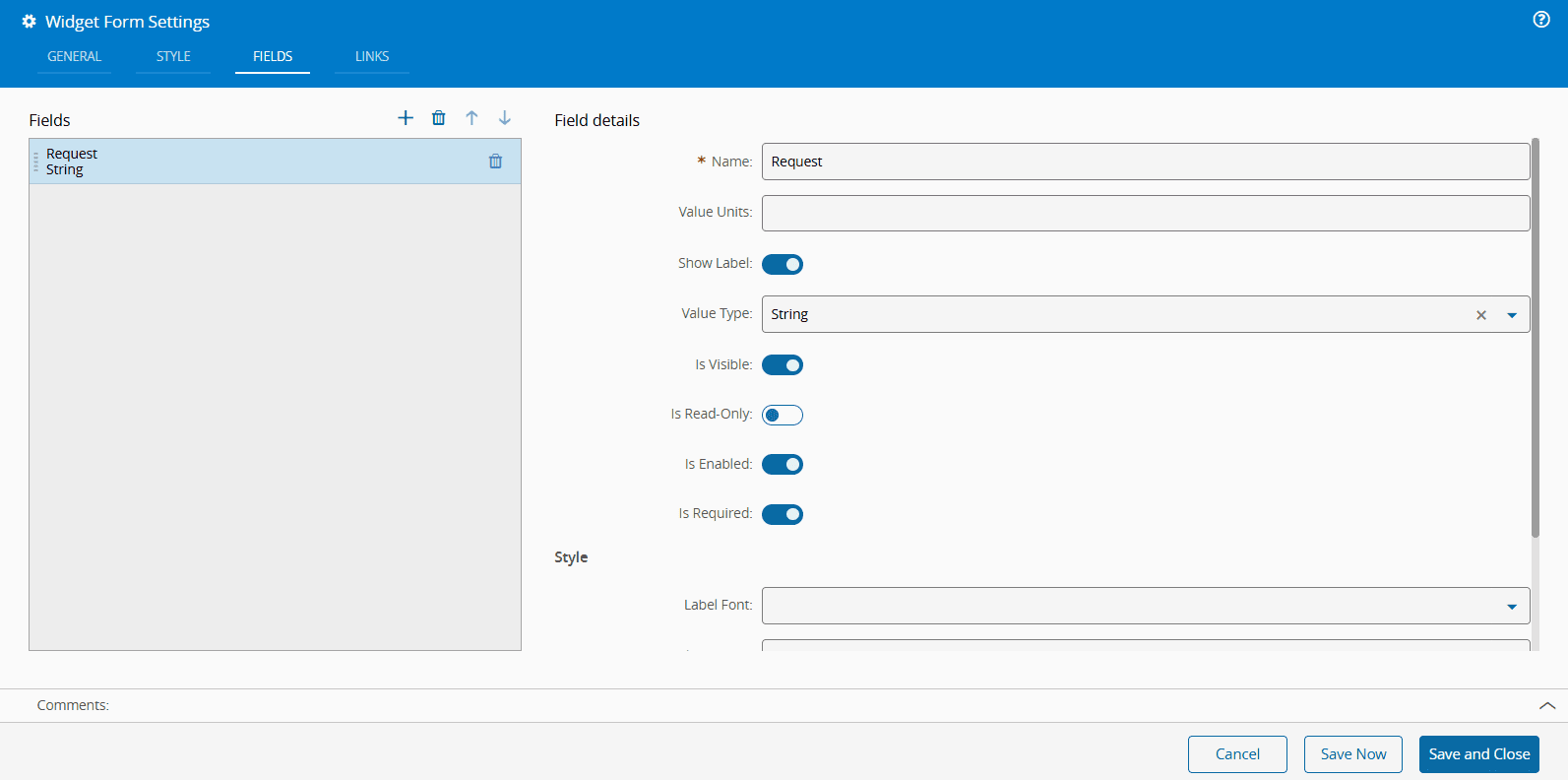 2. Add a Form widget to the UI Page, with a Field named Request and set its Value Type to String. For more information, see the Form widget.